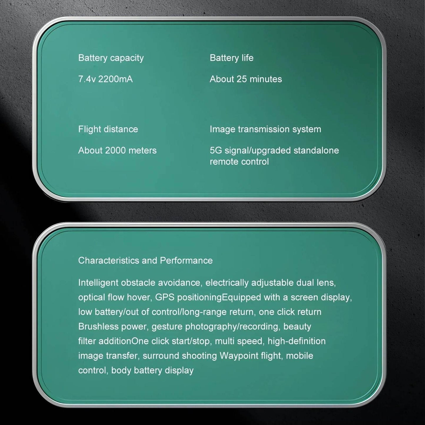 This drone integrates professional-grade aerial photography capabilities with innovative technology to elevate your shooting experience. The 8K camera delivers crystal-clear MP4 videos while the four-axis stabilization system guarantees steady flight even in challenging conditions. Built-in 5G WIFI and GPS systems provide precise positioning and uninterrupted control, supported by an FPV remote control with a built-in display for immediate feedback. Additionally, the drone features an omnidirectional sensing system with laser obstacle avoidance, enhancing safety during complex flights. With a lightweight body of 260g and removable batteries, it offers ease of use and flexible power management, perfect for extended shooting sessions.
