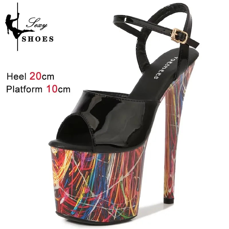 - Super high thin heel measuring 20 cm with a platform height of 10 cm for added stability