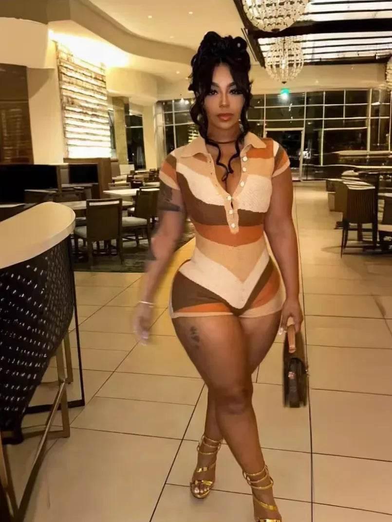 Laxsesu Irregular Contrast Romper Women Knit Stretch Polo Neck Single-Breasted Shorts Sleeve Skinny Slim Playsuits Streetwear