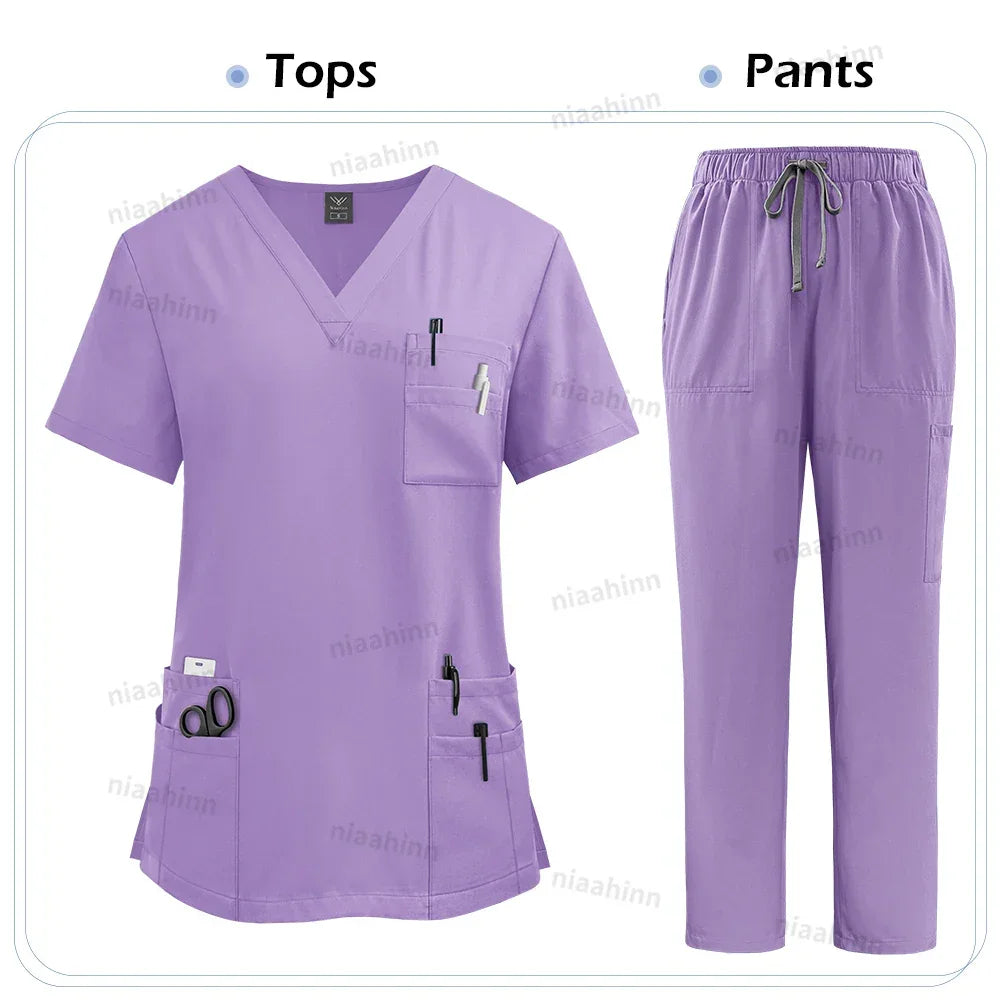 - Multi-functional pocket pants combined with V-neck scrubs tops for practicality