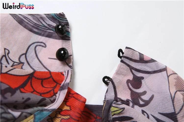 Weird Puss See Through Jumpsuit Women Backless Dragon Print Short Sleeve Fitness Activity Workout Overalls Slim Stretch Clubwear