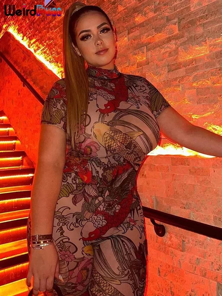 Elevate your fitness and clubwear wardrobe with the Weird Puss See Through Jumpsuit Women Backless Dragon Print Short Sleeve Fitness Activity Workout Overalls Slim Stretch Clubwear. This striking jumpsuit combines bold design with functional athletic performance, making it a must-have for women who want to stand out while staying comfortable during workouts or night outs. The unique dragon print and backless style offer a sexy edge that complements its sleek, skinny fit.